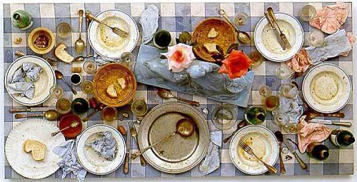 Qu’en est-il de la propension des hommes à ritualiser par une mise en scène esthétique – dans cette série ouverte de cérémoniaux – une inéluctable avancée vers le désordre, la mort, le chaos ? Bien perspicace l’anthropologue ou le sociologue ou n’importe quel autre expert patenté des sciences humaines qui en donnera la clé. Il est possible qu’au fond de ces phénomènes gise le mystère du mal – ni une énigme, ni une question, ni un problème – mais bel et bien un mystère. Je hasarderais que la malédiction des appétits et des manducations nécessaires, prise dans les mâchoires du temps, apporte une esquisse d’indication. Tournant autour de cette interrogation, sans espoir d’une résolution, je tends la main vers Baudelaire – doux paradis artificiel d’un millier de pages ! – ouvert au sonnet justement nommé :